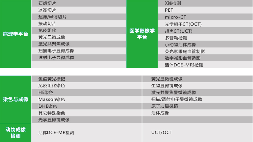 可提供各种病理切片制备和分析服务。本平台拥有动物大组织冷冻切片机、病理切片扫描和分析系统、激光共聚焦显微镜、投射电子显微镜等仪器。本平台还可提供动物医学影像学诊断和分析服务,包括microCT、超声医学、核磁共振、脑定位等技术服务。